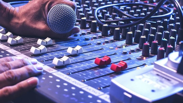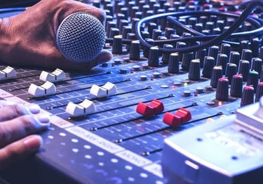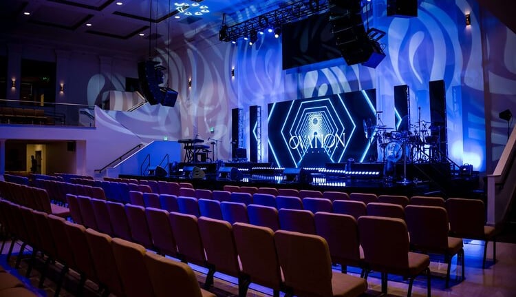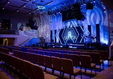 Audio-visual equipment setup with mic, projector, stage, and lighting for seamless presentations, performances, and memorable event experiences.